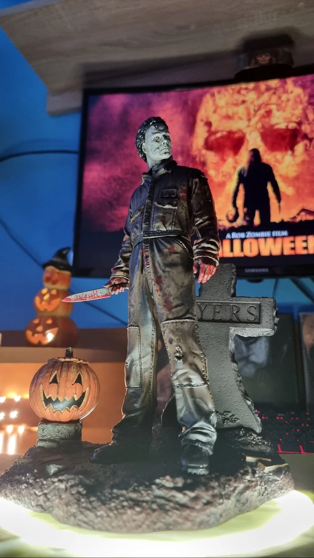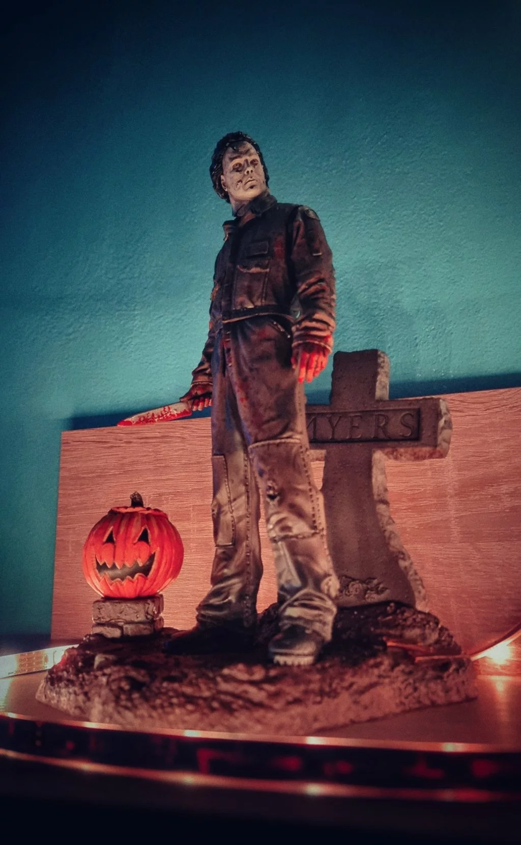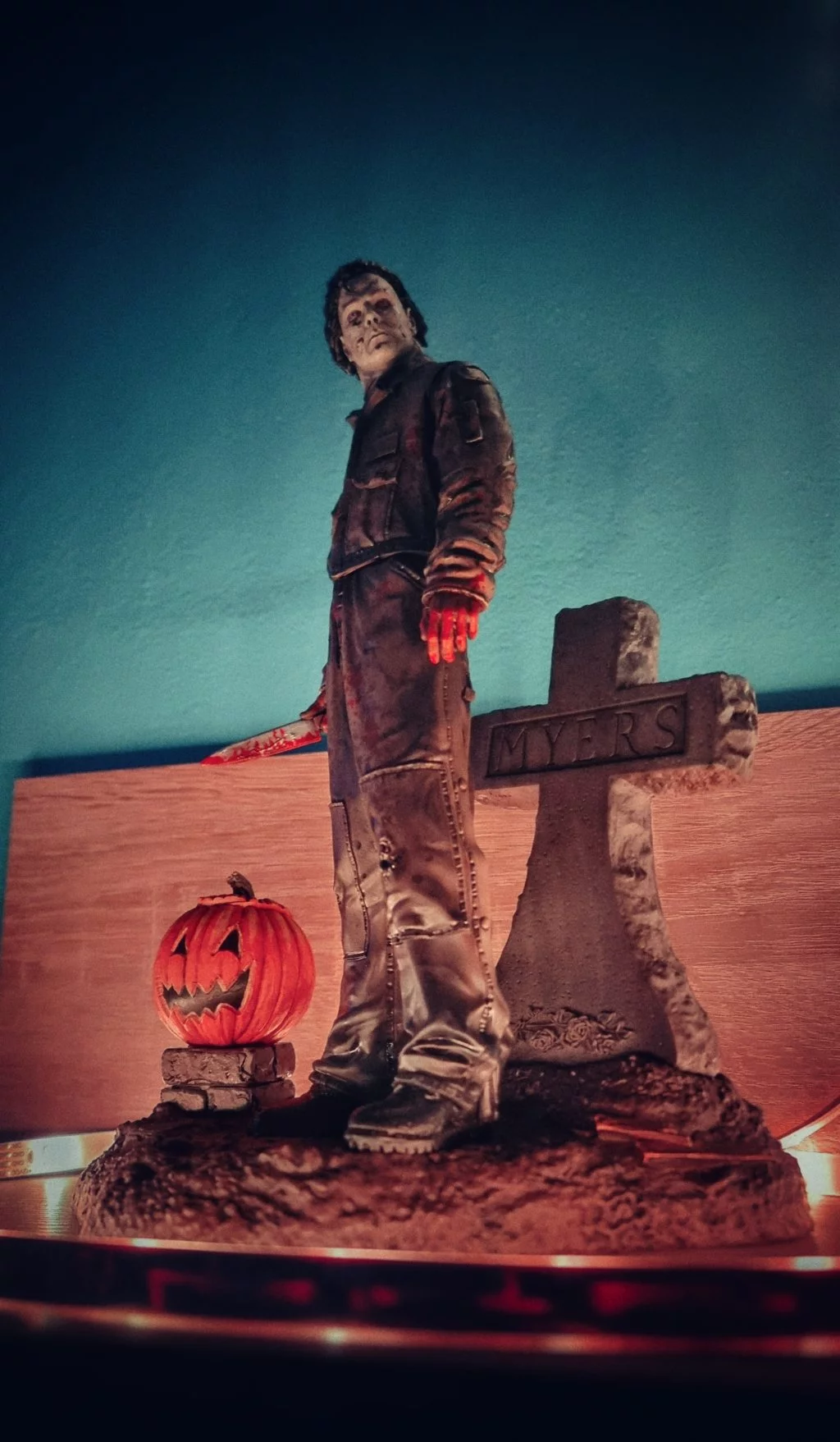 A 13 darabból megépítheted a legendás gyilkos, Michael Myers remekül megmunkált szobrát. A darabok könnyen összeilleszthetők, így egy lenyűgöző szobor jön létre, amelyen Michael egy sírkő és egy tök mellett látható, késsel a kezében.