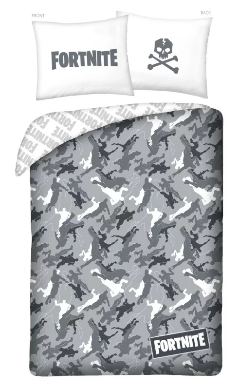 Gyönyörű szürke nyomtatott ágynemű a népszerű Battle Royale játék, a Fortnite rajongóinak.