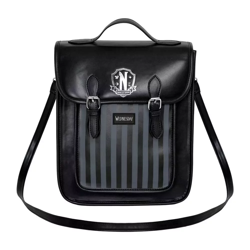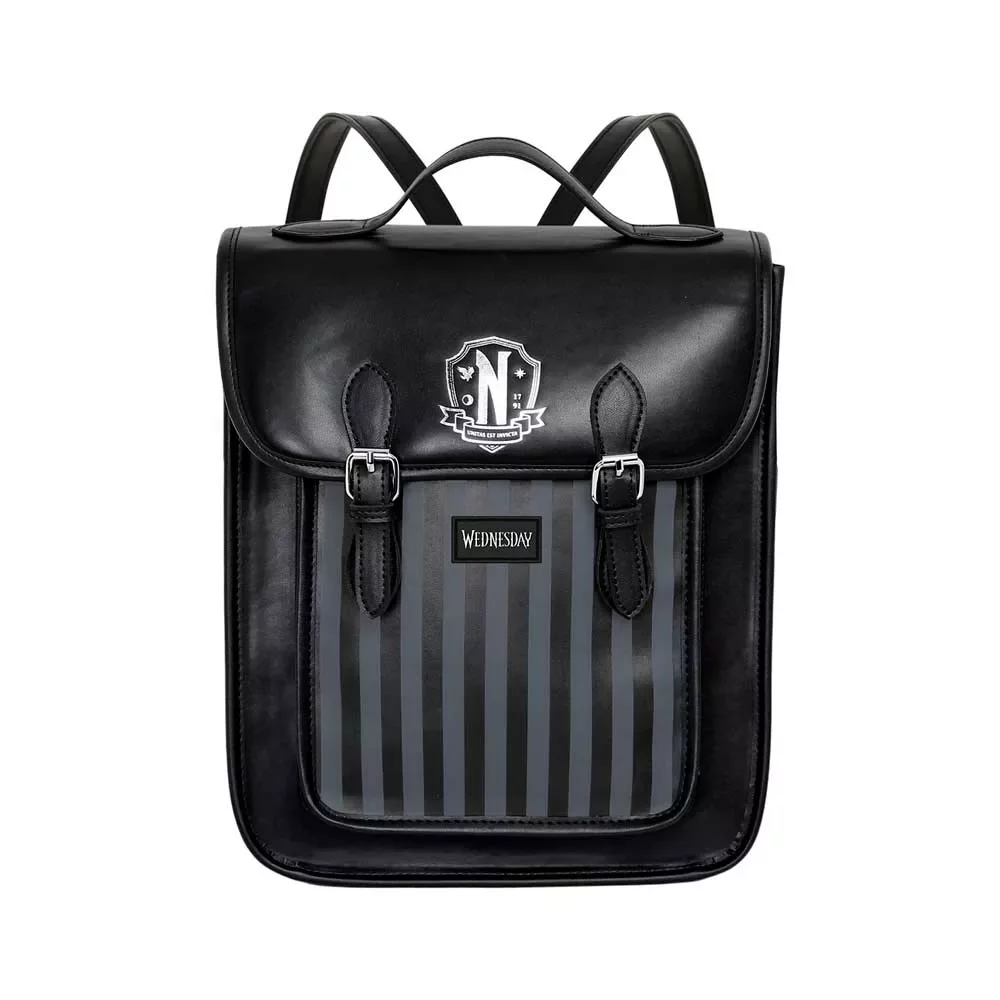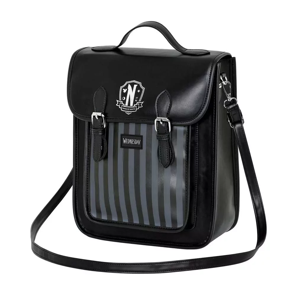 Hátizsák a szerdai Netflix-siker rajongóinak, a Nevermore iskola címerével díszítve. A hátizsák cserélhető, állítható pántokkal rendelkezik, amelyek segítségével kiválaszthatod, hogy hagyományos hátizsákként vagy kézitáskaként szeretnéd viselni. A hátizsák mágneses rögzítéssel és egy elülső, patenttal fedett zsebbel, egy laptopzsebbel és rengeteg rekesszel rendelkezik.