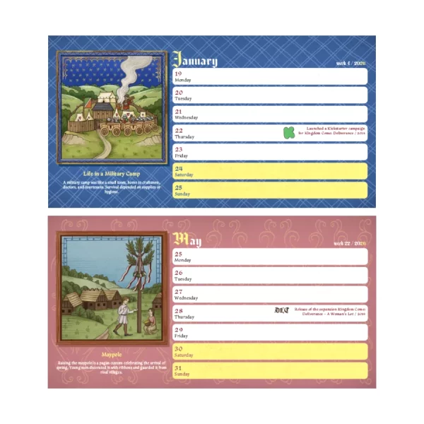 A Kingdom Come: Deliverance II naptárak neki lettek kitalálva.A falinaptár minden hónapban egy új illusztrációt hoz a játék világából, így egész évben középkori hangulatot varázsol a falra. Az asztali naptár pedig hétről hétre egészíti ki az íróasztalt a játék kódexéből származó képekkel és apró érdekességekkel a középkori cseh életről. Mindkét naptár remek ajándék a karácsonyfa alá minden Kingdom Come: Deliverance II rajongónak, és egész évben örömet hoz majd.