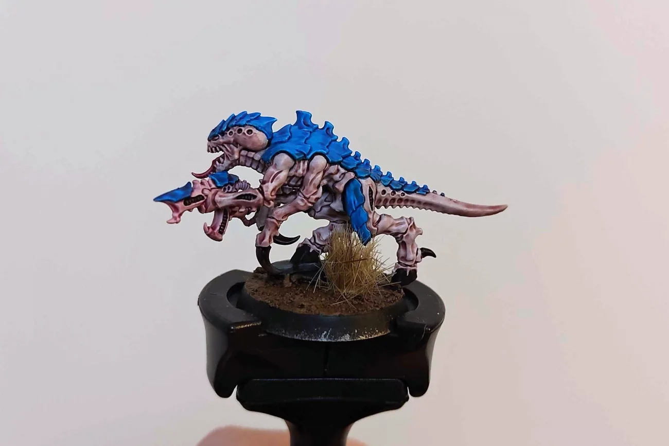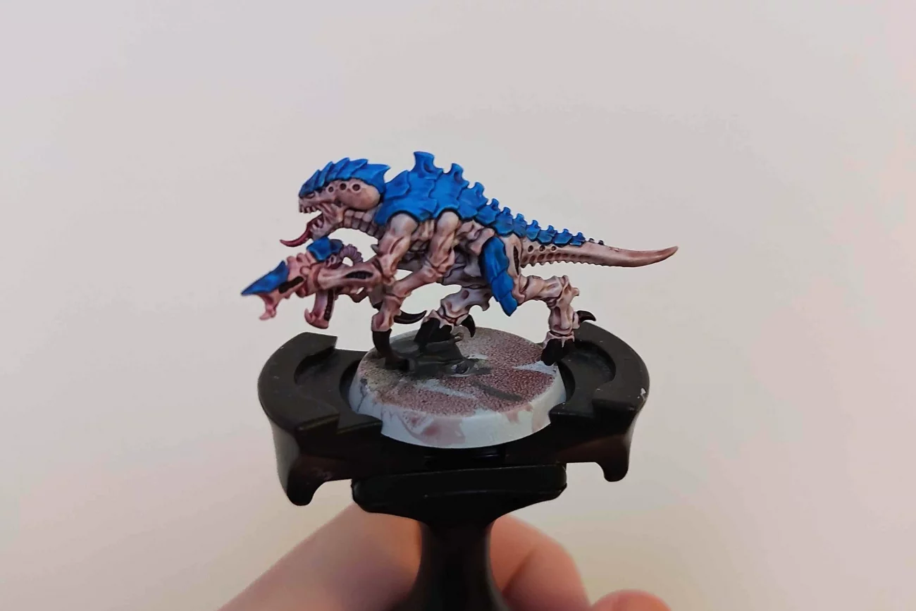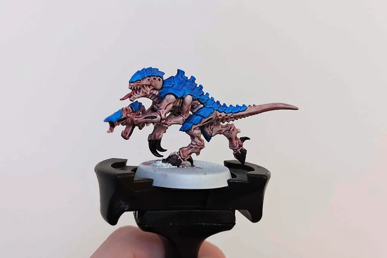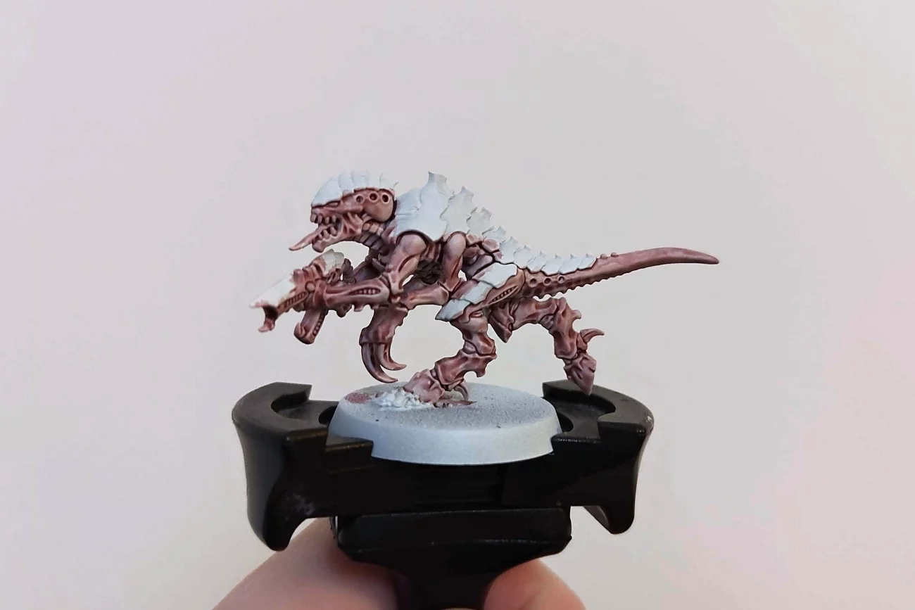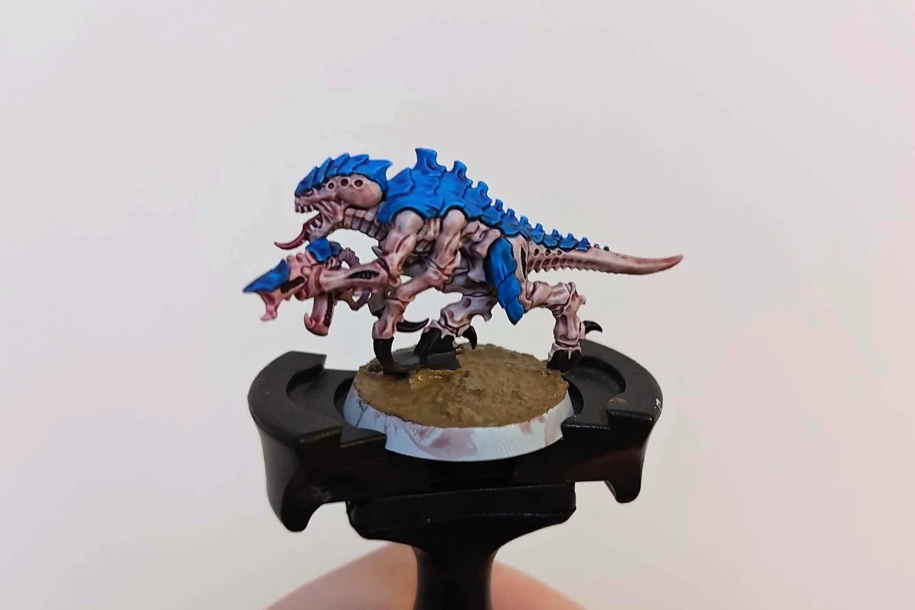 (A képeken látható figura Termagant, sprej White Scar, Guilliman Flesh, Magos Purple, Contrast Medium, Talassar Blue, Shyish Purple, Volupus Pink, Bázis: Dawnstone, Leadbelcher, Armageddon Dust, Agrax Earthshade, Abaddon Black, Dryad Bark, fű a GSW-től)