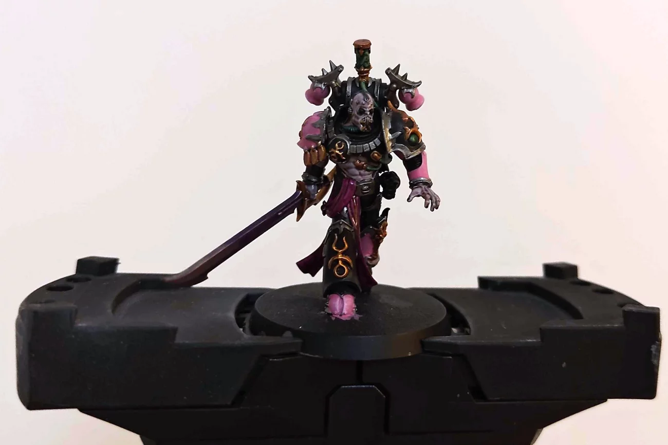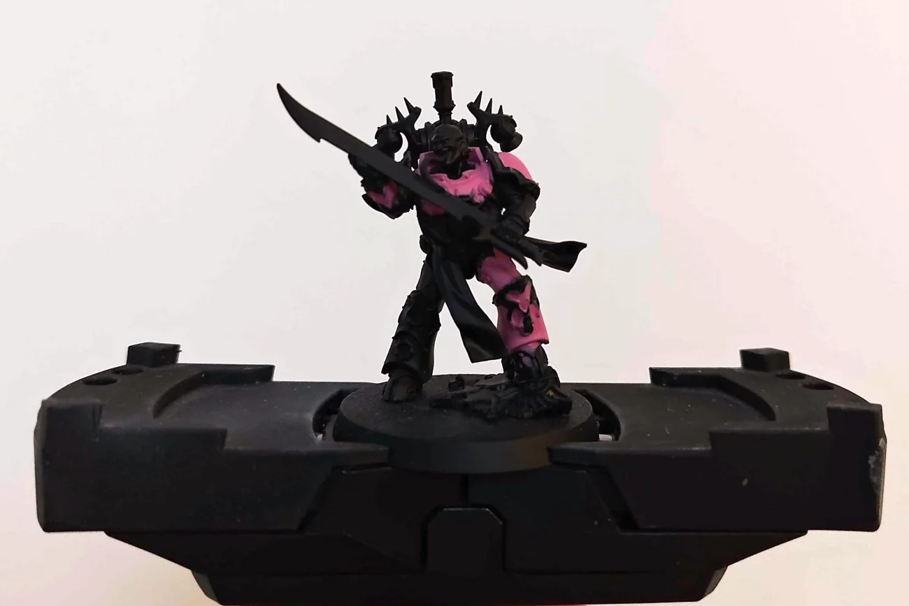 (A képeken látható figura Flawless Blades, sprej Chaos Black, Emperor´s Children, Fulgrim Pink, Abaddon Black, Leadbelcher, Corax White, Retributor Armour, Waprstone Glow, Skarsnik Green, Druchii Violet, Reikland Fleshshade, Nuln Oil, Sigvald Burgundy)
