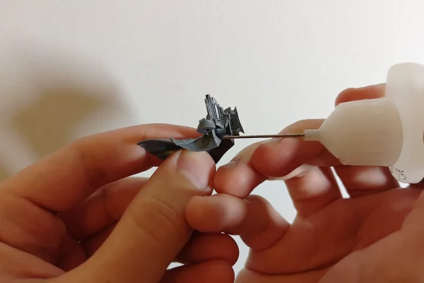 A figurát mindig jól szellőző helyen fújd le, viselj légzésvédőt, és használj megfelelő védőfelszerelést. Használat előtt minden esetben olvasd el a spray flakonon található útmutatót. Az ideális módszer, ha a figurát nyolc különböző szögből fújod le, körülbelül 20 cm távolságból. Kezdd 45°-os szögben (tehát ne közvetlenül szemből), majd fújd alulról 45°-ban, végül felülről. Miután így körbefújtad a modellt, érdemes átnézni a figurát, és azokat a részeket, ahol még átlátszik a műanyag (például a köpeny alatt), utólag átfújni. Mindig rövid fújásokkal, folyamatos mozgás közben dolgozz, hogy elkerüld a túl vastag festékréteg kialakulását, amely eltakarhatja a részleteket.
