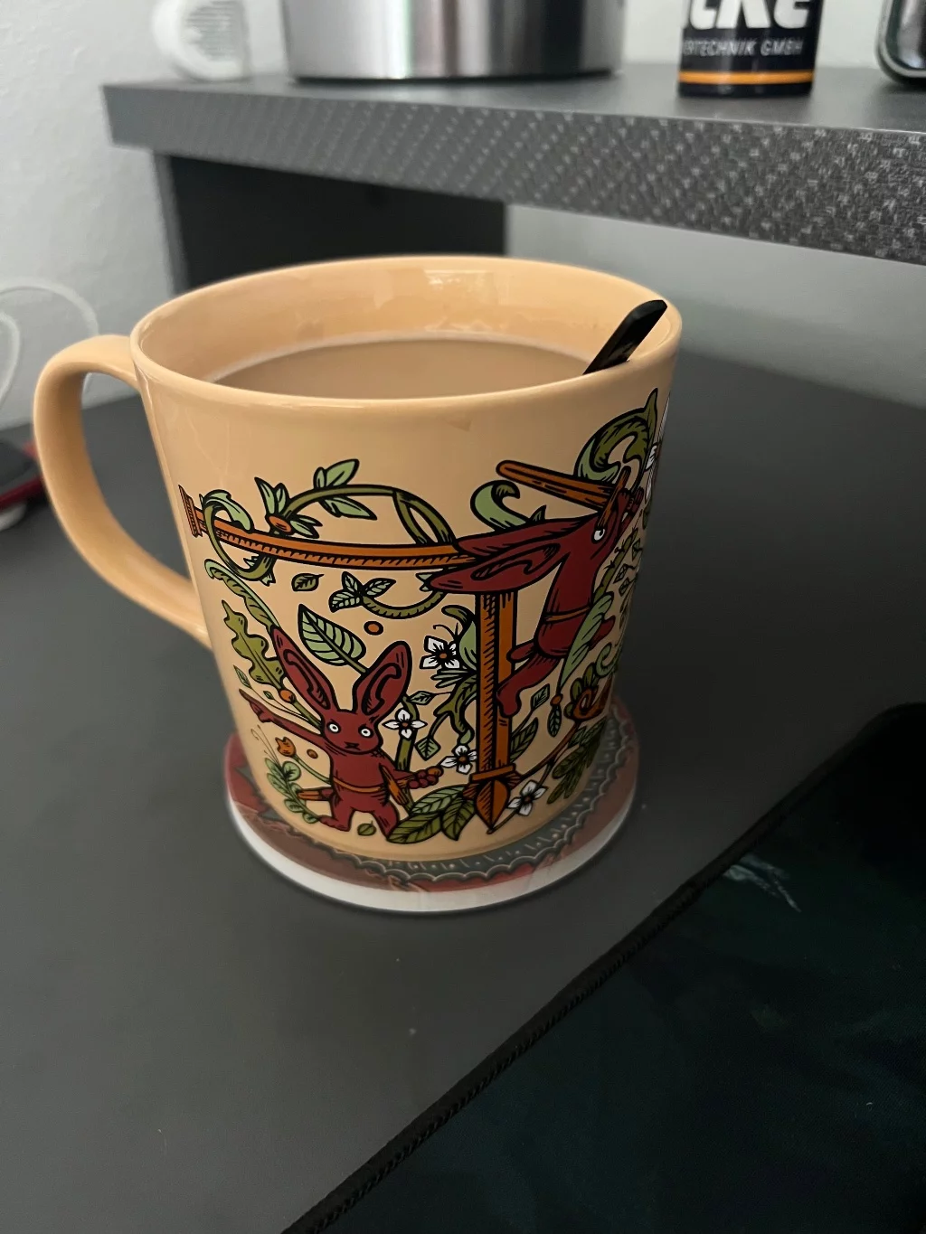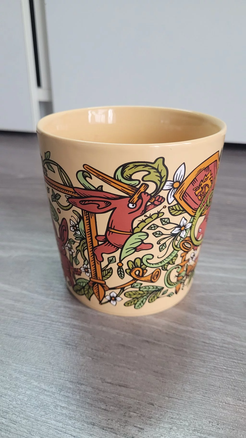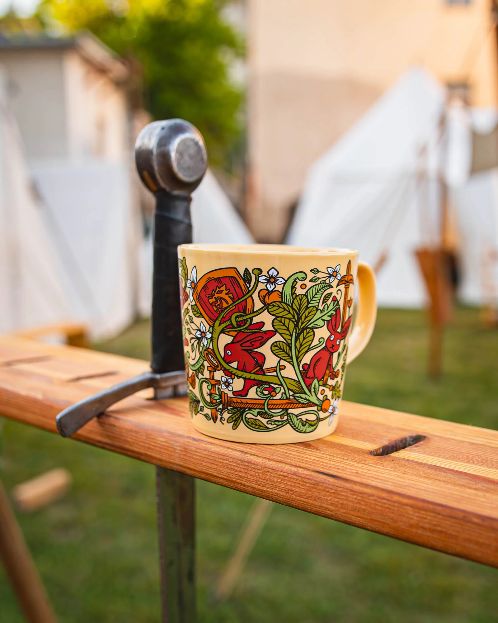 Aranyosak, de felfegyverkezve. A kedvelt nyulak, akik a virágzó rengetegben rejtőznek, gondoskodnak róla, hogy italodat ne lopja el egyetlen gazfickó sem. A nagy, 500 ml-es kerámia bögre bőséges adag teát vagy fáradtság elleni kávéfőzetet kínál. Az alján pedig a Kingdom Come: Deliverance II hivatalos logója található.