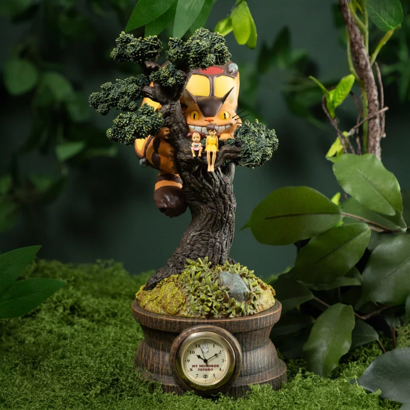 Mei és Satsuki a fán ülve, a megbúvó Macskabusz és az aprólékos részletek egyenesen a filmből kiragadott jelenetet idéznek. A beépített óra diszkréten egészíti ki a diorámát, így nemcsak dekoráció, hanem egyben funkcionális lakásdísz is.