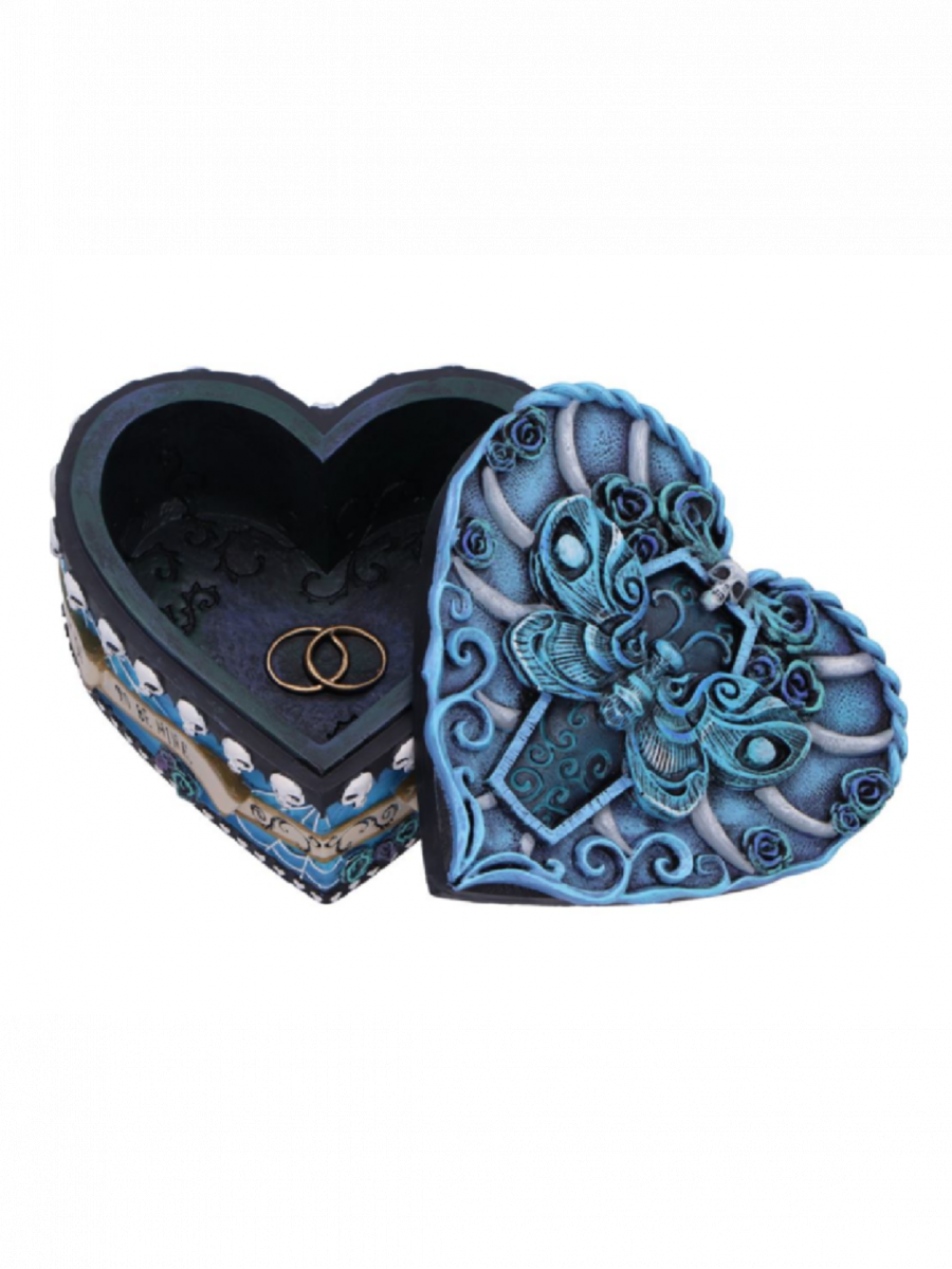 A Corpse Bride – With This Ring szívdoboz a Nemesis Now-tól kék ornamentikával és pillangóval díszítve, Tim Burton filmjének varázslatosan komor esztétikája ihlette. Egyedi dekoráció és apró kincsek tárolására is alkalmas darab, amely minden rajongót elbűvöl ebben a gótikus románcban.Anyag: polyműgyanta