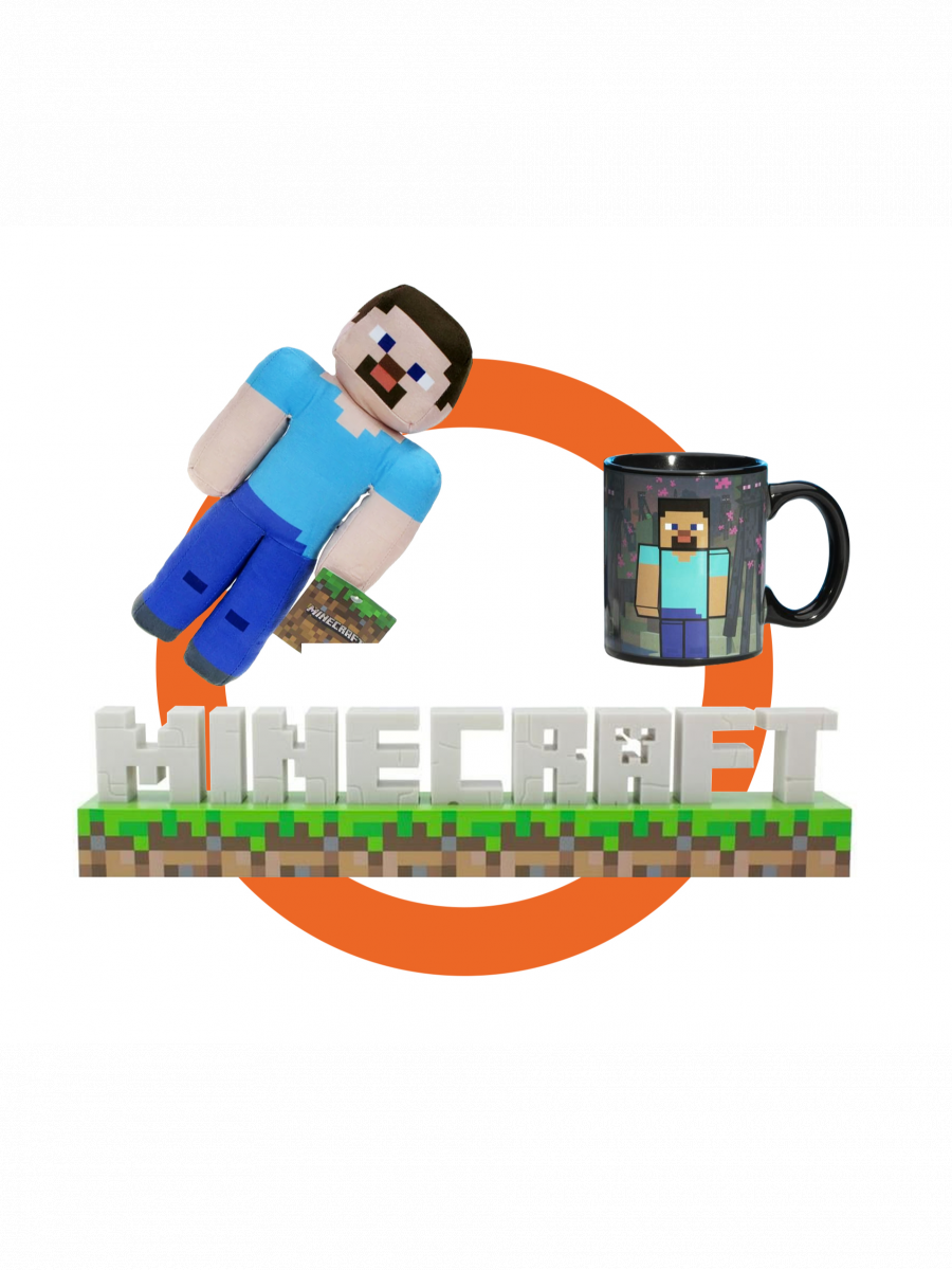 Stílusos csomag, amely egy plüssállatot, egy lámpát és egy bögrét tartalmaz Steve - a legendás Minecraft játék hősének - motívumával.