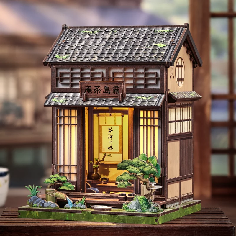 A fa homlokzat, a tolóajtók, a bejárat előtti bonsai és a meleg belső megvilágítás autentikus és meghitt megjelenést kölcsönöznek a modellnek.Odabent gondosan kidolgozott részletek várnak – a könyvespolctól és a teaszerviztől kezdve a falakon elhelyezett dekorációkig. Ideális projekt a miniatúrák szerelmeseinek, akik lépésről lépésre szeretnék élvezni az alkotás folyamatát, majd a végén egy egyedi, japán hangulatú darabot kiállítani.