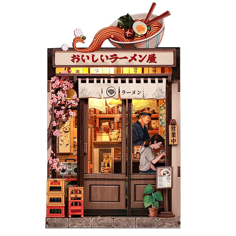 A kis ramenbár virágzó szakurával, részletgazdagon kidolgozott belső térrel és meleg fényekkel hitelesen idézi meg a japán nyugalom hangulatát.Minden apró részlet – a feliratoktól és edényektől kezdve az üzleten belüli jelenetig – életet és történetet ad a modellnek. Ideális projekt mindazok számára, akik szeretik az alkotást, és egy részletekben gazdag, egyedi hangulatú, meghitt mini jelenetet szeretnének kiállítani.