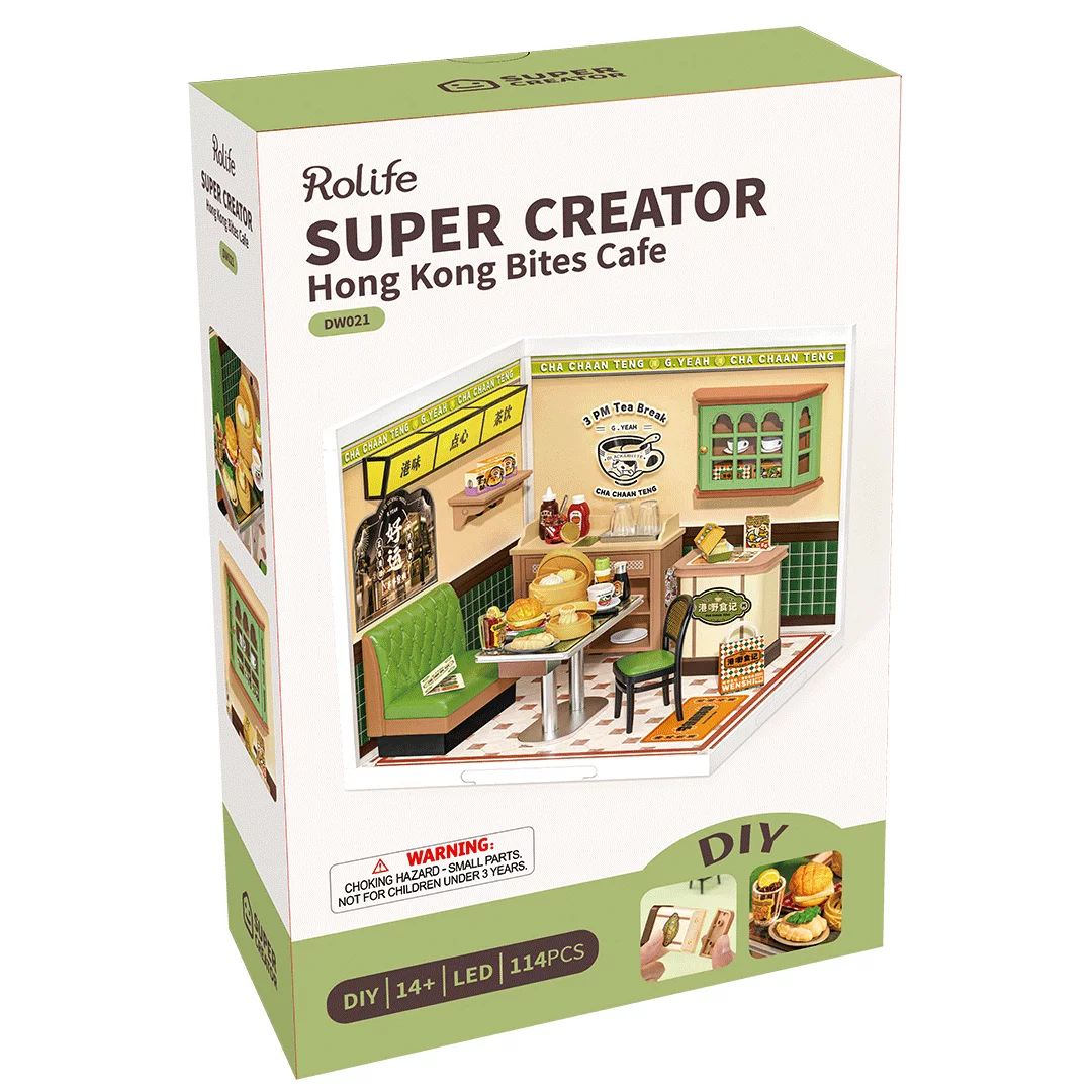 Részletgazdagon kidolgozott DIY miniatűr ház, amelyet Hongkong ikonikus teakultúrája ihletett, és amely hűen megjeleníti a helyi különlegességeket, a stílusos belső teret, valamint a Rolife Super Creator sorozatra jellemző moduláris, egymásra rakható kialakítást.Méret: 163 x 176 x 152 mm