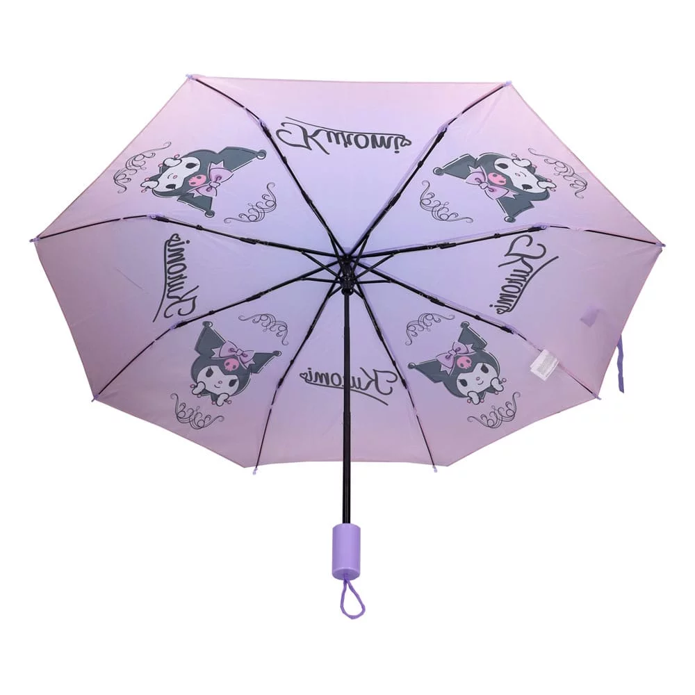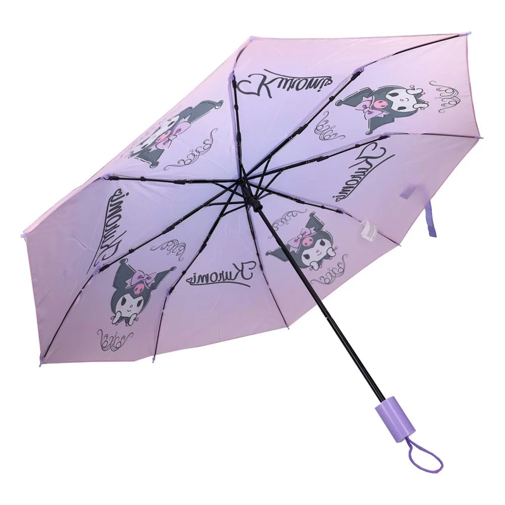 Aranyos, összecsukható esernyő Kuromi mintával, amely megvéd az esőtől, és stílusos hangulatot kölcsönöz a napodnak a finom lila-rózsaszín dizájnnal és az ikonikus Sanrio mintával.