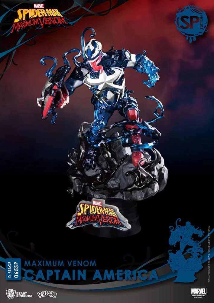 A Beast Kingdom bemutatja a diorámafigurák új sorozatát, amelyben a Venom szimbiótával megfertőzött híres Marvel-képregényhősök szerepelnek, a Maximum Venom Series néven. Ezeknek a figuráknak a limitált kiadása világszerte 4500 darabra korlátozódik, és különleges átlátszó hatású és egyedi csomagolású. Ez Amerika Kapitányt ábrázolja méreggel a testében!Méret: cca 16 cm