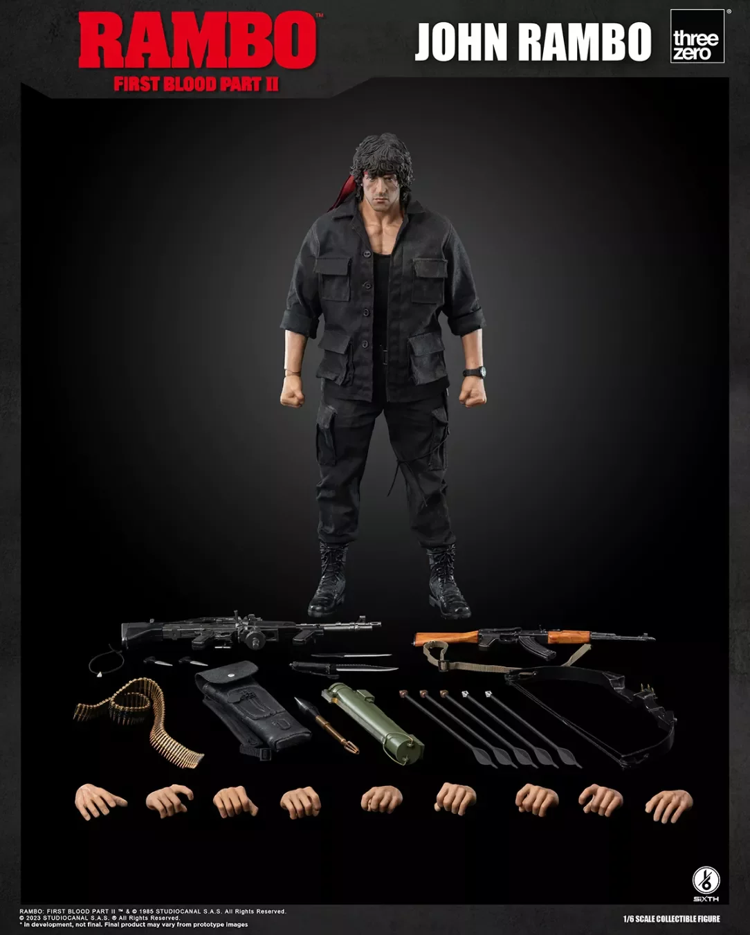 John Rambo II (Rambo: First Blood Part II) formájában, a Threezero művészei által tökéletesen kidolgozott figurában. A csomag számos cserélhető alkatrészt tartalmaz, köztük fegyvereket, testrészeket és felszereléseket, a figura pedig számos hajlítási ponttal rendelkezik. Így már csak rajtad múlik, milyen pózban fog Rambo kinézni a polcodon.A CSOMAG TARTALMA