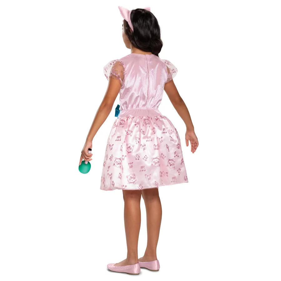 A rózsaszín ruha zenei mintákkal, csillogó ujjakkal, mikrofon kiegészítővel és masnival a derekán tökéletesen idézi Jigglypuff báját.