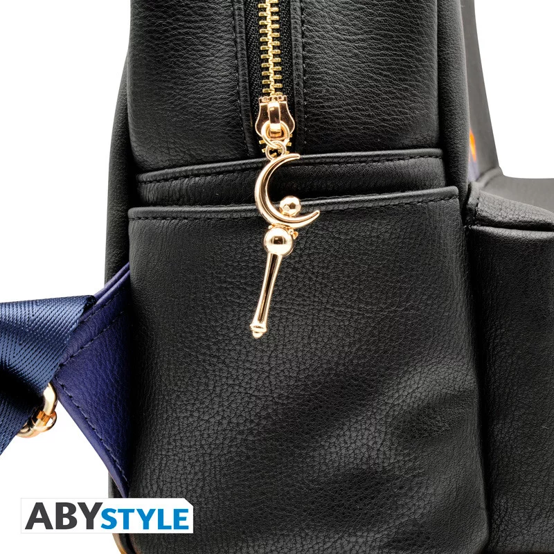 A stílusos hátizsák a Sailor Moon-ból ismert Luna motívumával ötvözi a visszafogott fekete dizájnt arany részletekkel és a bájosan hímzett macska-motívummal, félhold kíséretében.