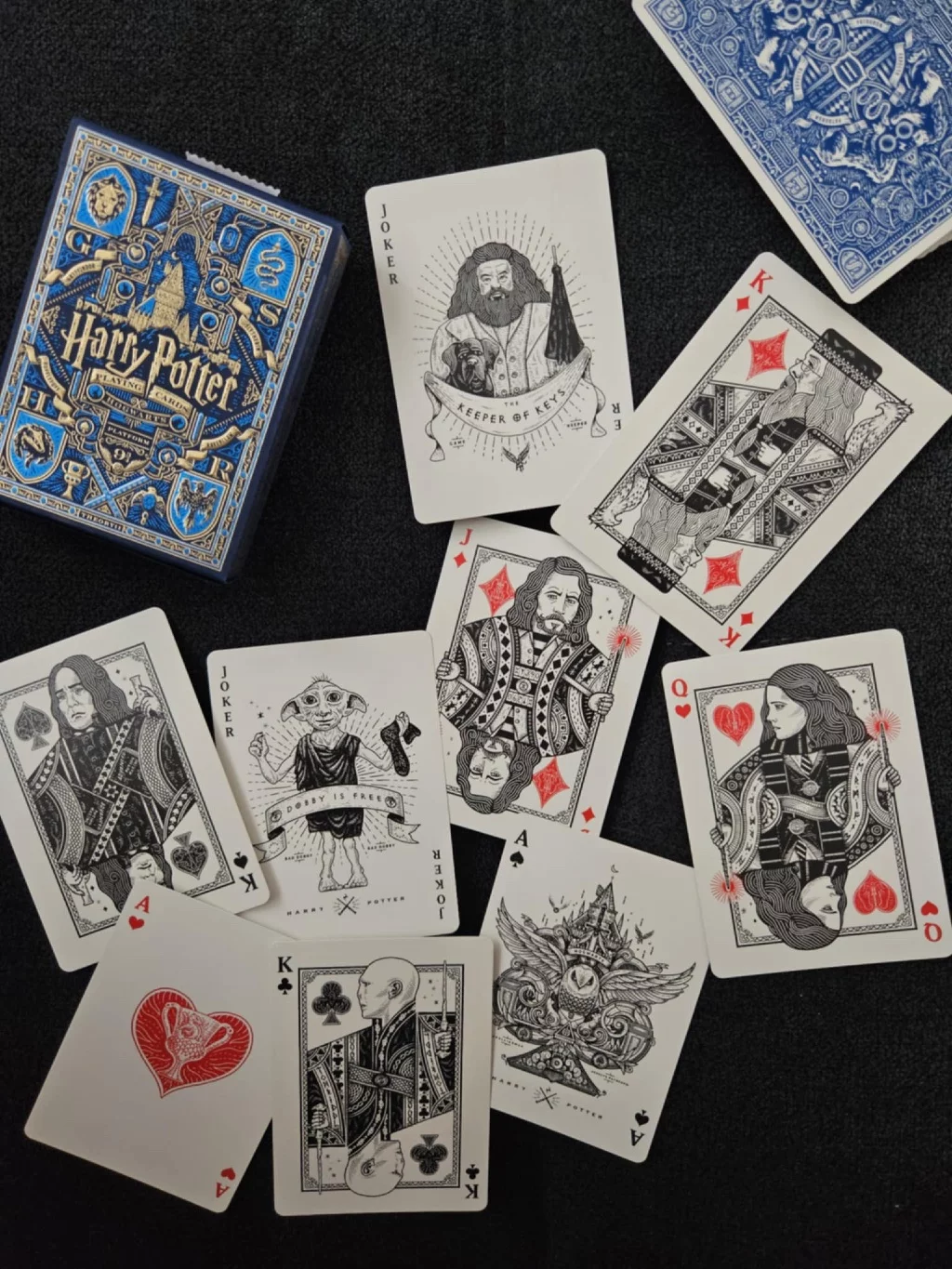 Gyönyörű kártyacsomag Harry Potter világának rajzfilmes motívumaival varázslóknak és mugliknak. Tartalmaz egy 52 lapból + 2 jokerből álló standard készletet, kiváló minőségű papírra, növényi alapú tintával nyomtatva. Az USA-ban készült. Luxusdobozba csomagolva. Tökéletes az esőzéshez!
