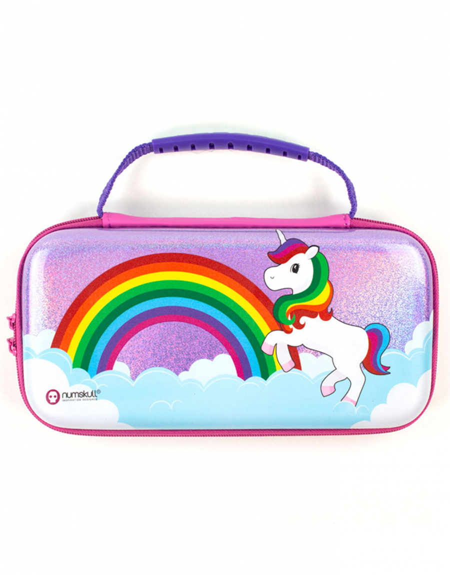 Védőtok Nintendo Switch Lite konzolodhoz kemény kivitelben, aranyos szivárvány és egyszarvú motívummal. A tok nem csak a konzolnak ad helyet, hanem a kábeleknek és egyéb kiegészítőknek is. A rekeszekben akár 8 játékkártya is elfér.Gyártó: Numskull