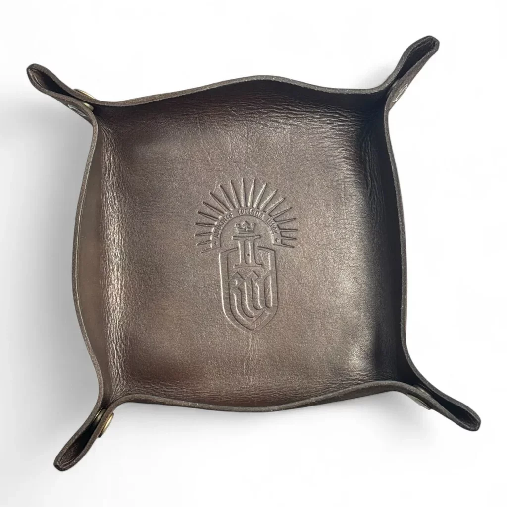 Bőr dobópohár és dobókockák egy praktikus kockatálcával (dice tray) egy szettben, amely még hangulatosabbá tesz minden baráti estét a tábortűz mellett.