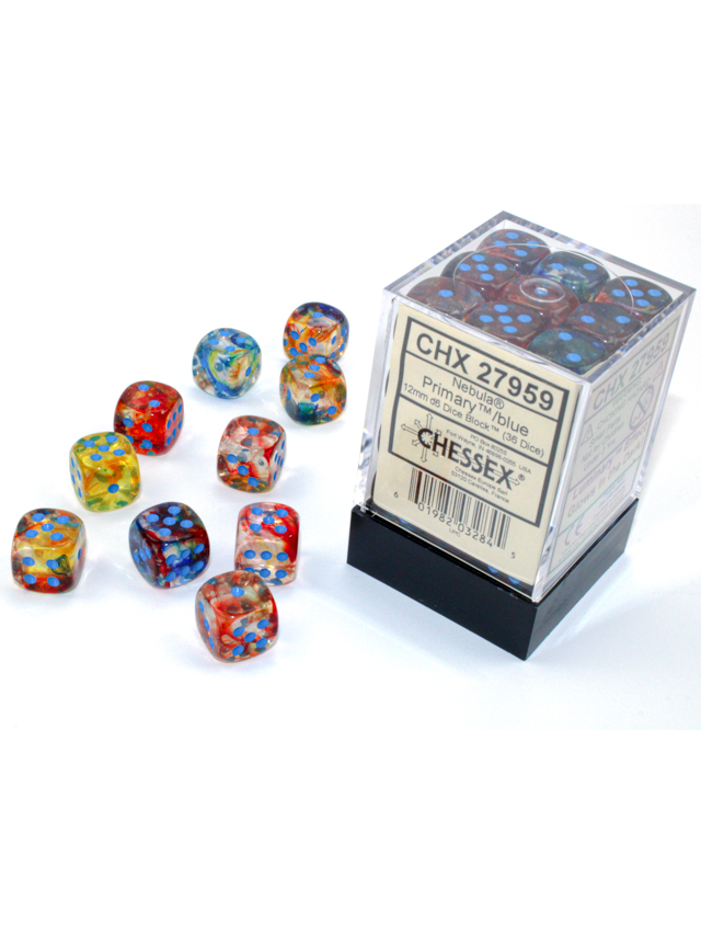 Nebula készlet – Primary (36 db) a Chessex-től átlátszó keveréket kínál piros, kék és sárga színekből, élénk kék pöttyökkel és Luminary™ effektussal, ami megvilágítva ragyogó csillagviharvá varázsolja a dobókockákat.