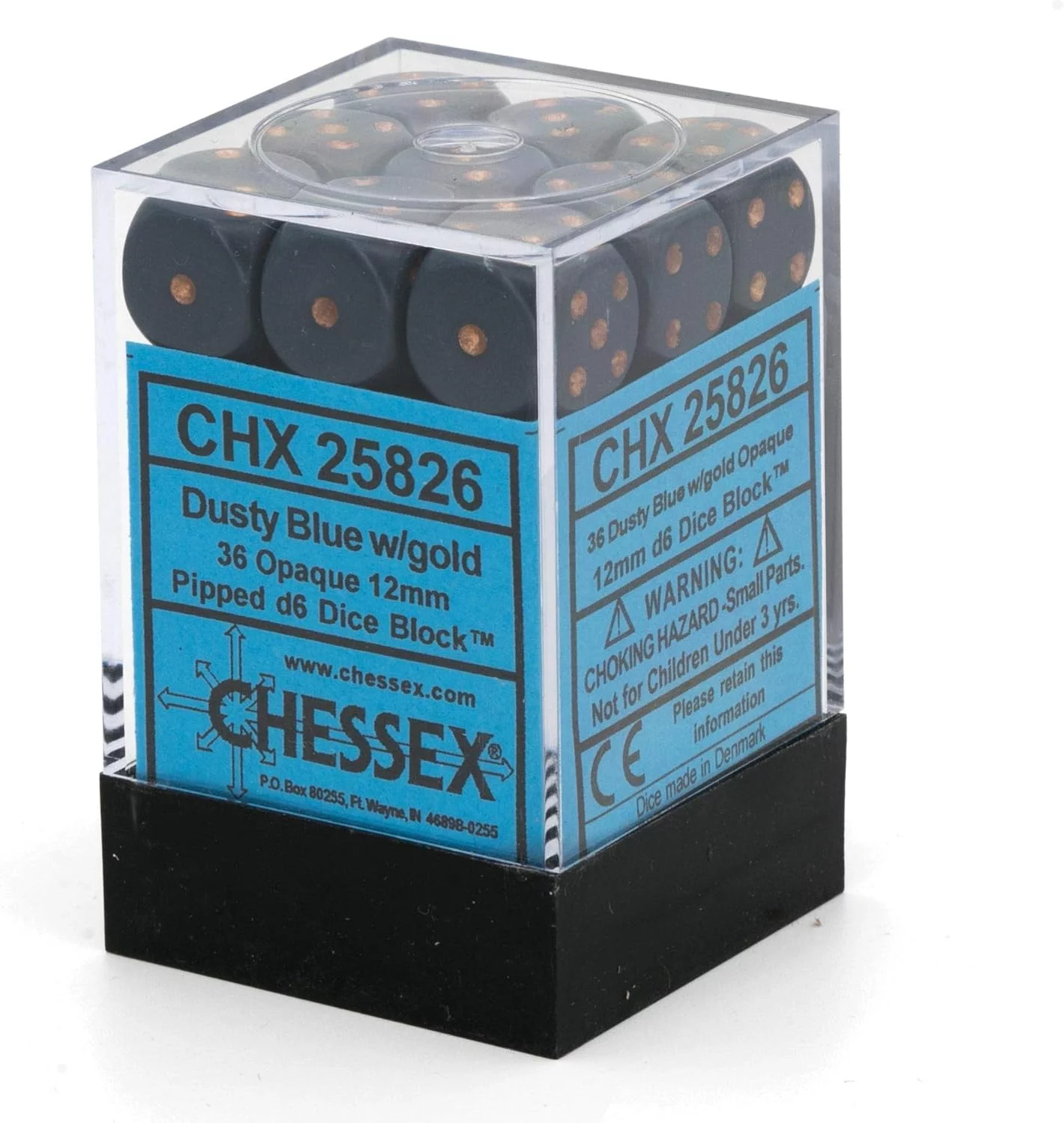 A Chessex Opaque – Dusty Blue (36 db) hatoldalú dobókocka-készlet elegáns kék-arany színkombinációjával ideális választás társas- és szerepjátékokhoz.