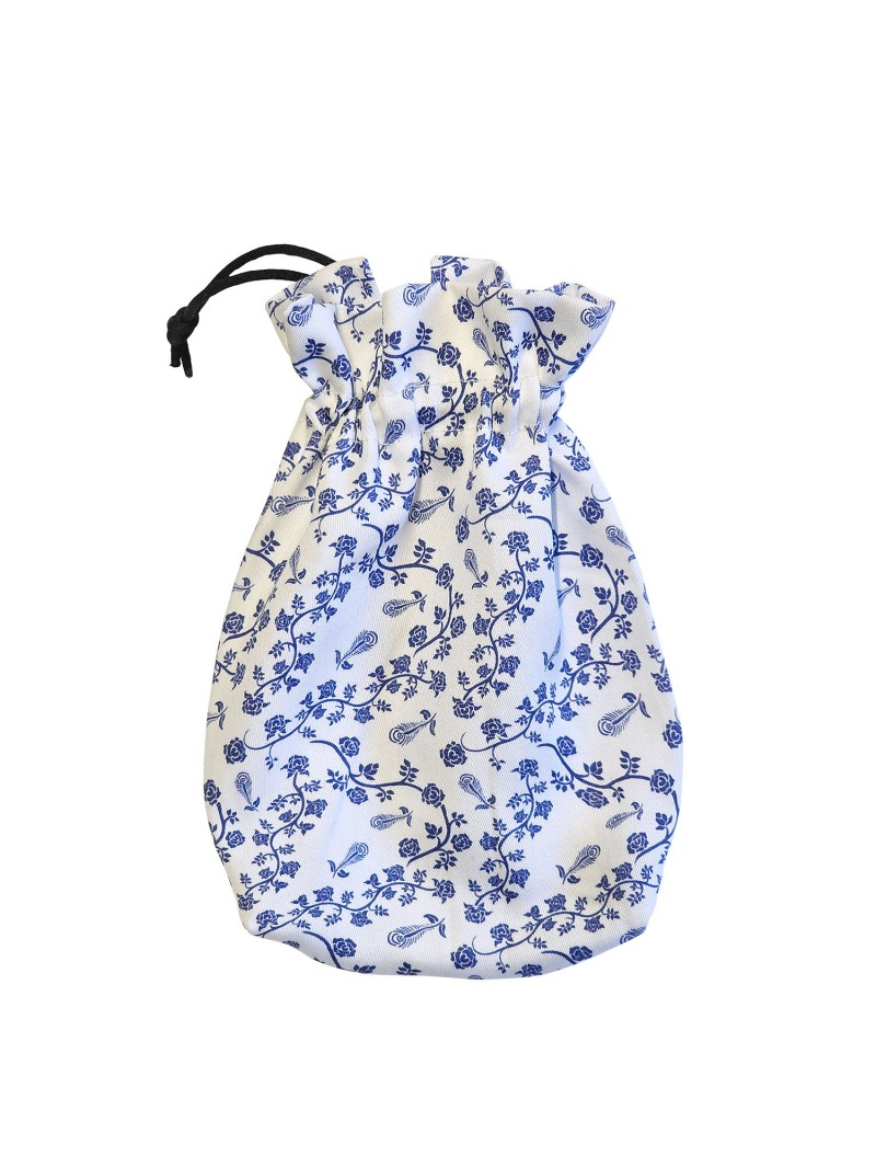 Elegáns, porcelánmintás kockazsák, amely biztosítja kockáid biztonságos tárolását és stílusos megjelenését.Anyag: pamut