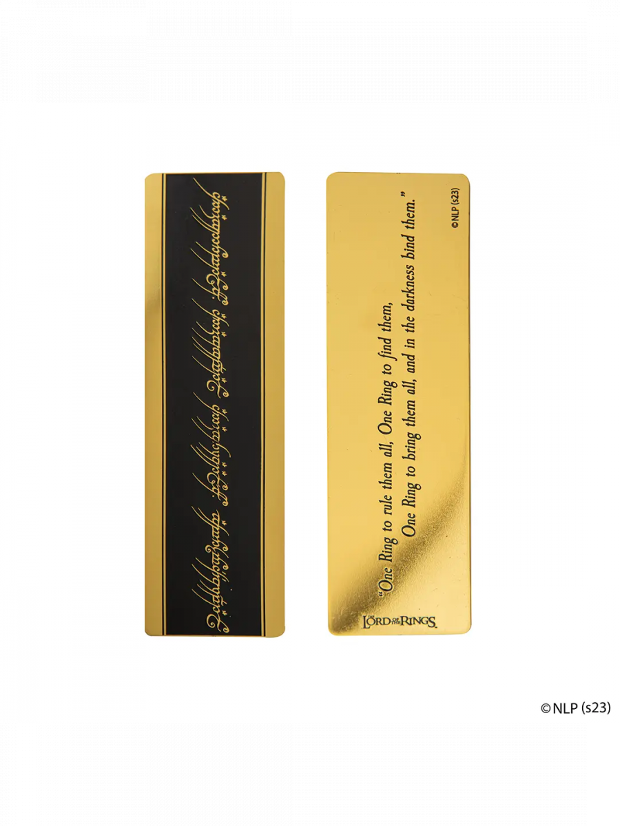 Elegáns, A Gyűrűk Ura által inspirált fém könyvjelző, amelyet az Egy Gyűrű ikonikus felirata díszít fekete beszéd nyelvén.