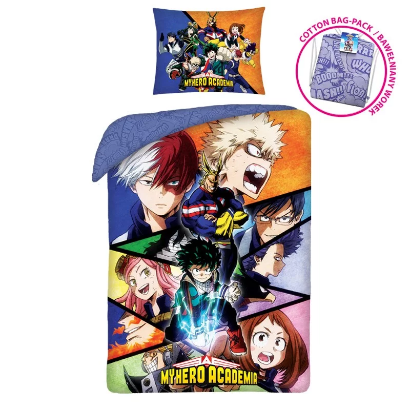 Ágynemű minden japán sorozat és képregény rajongónak (anime a manga) My Hero Academia sorozatból. Különleges ajándékunk egy pamut hátizsák hasonló témával. Méretei: takaróhuzat (140 x 200 cm), vánkoshuzat (140 x 200 cm). Anyag: 100% pamut