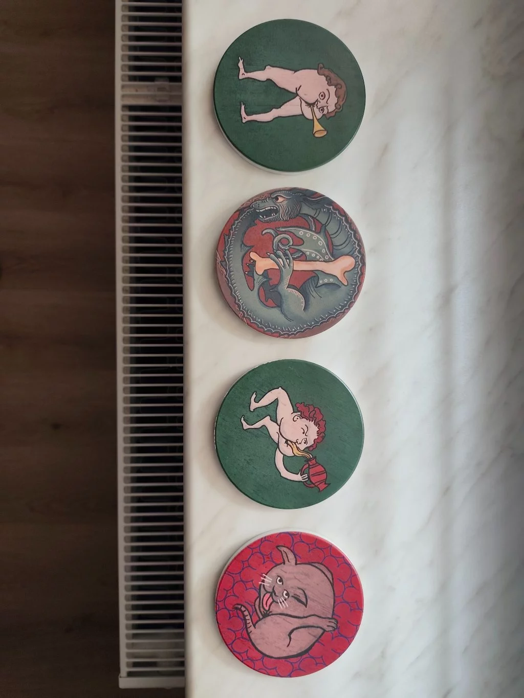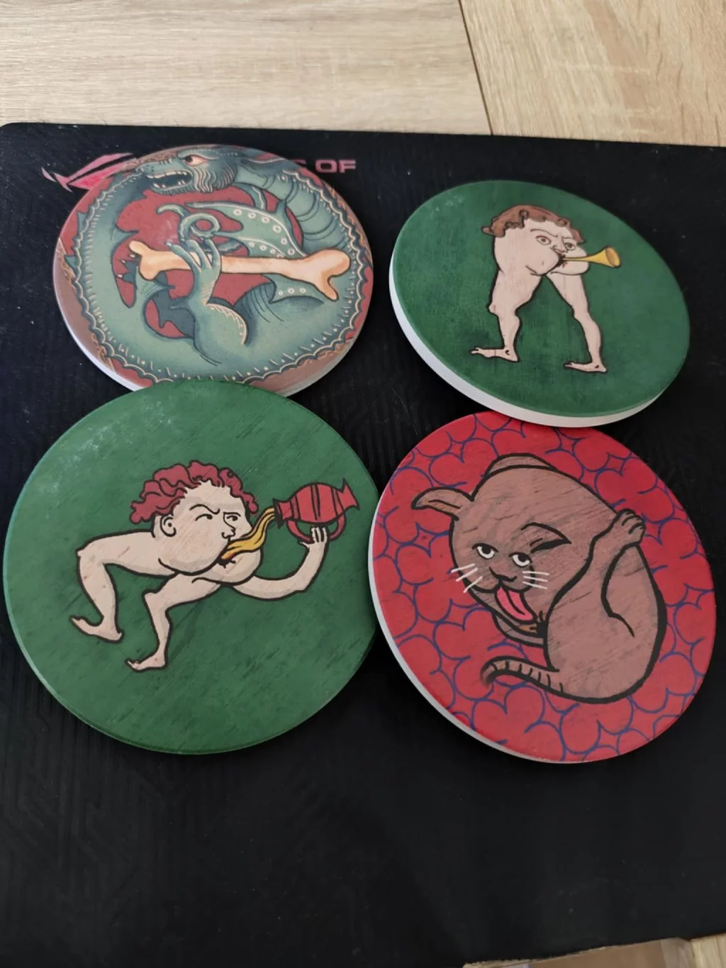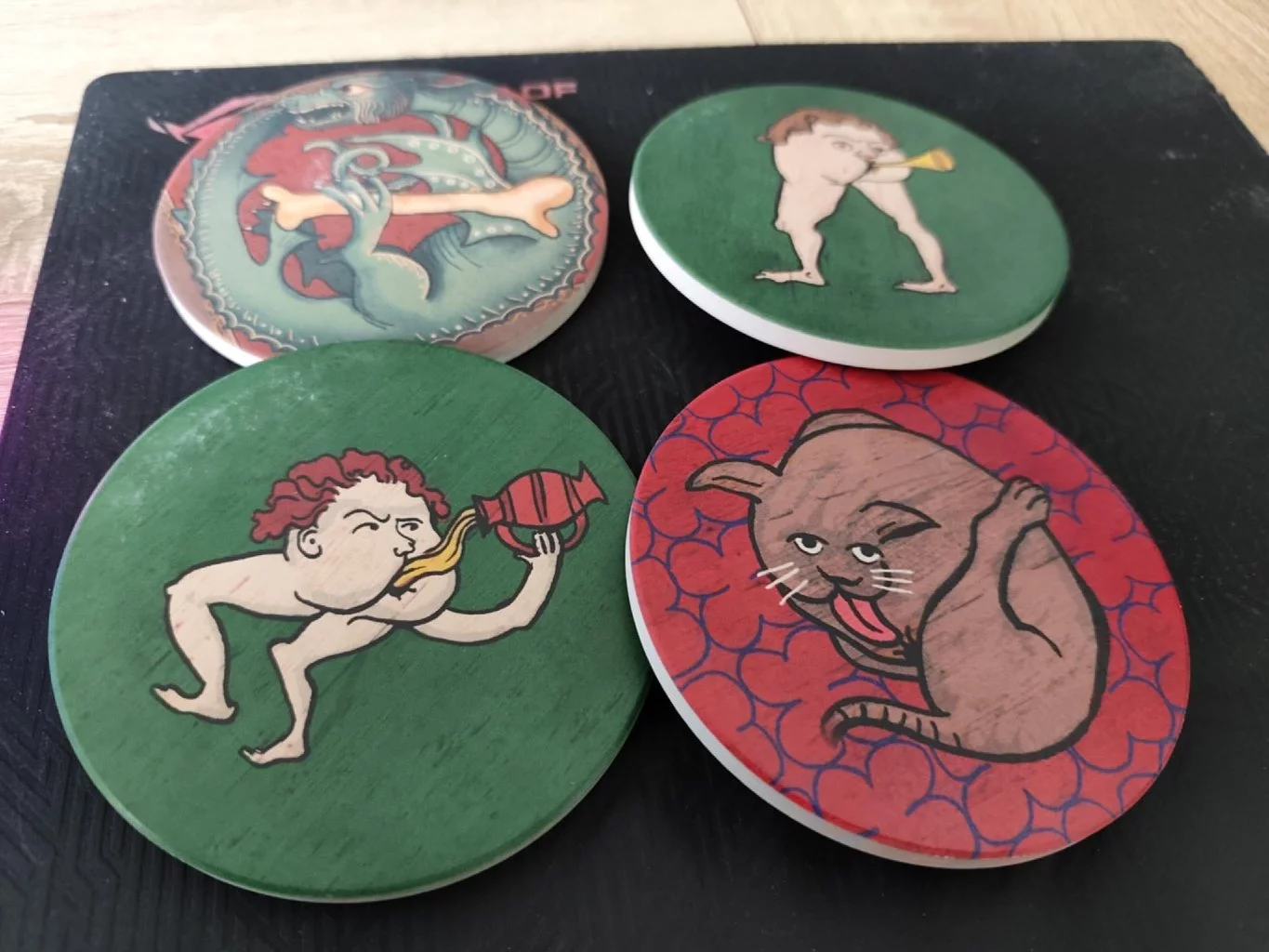 A középkori bölcsesség így szól: „Aki pohár nélkül iszik, leprát kap… vagy legalább egy nedves asztalt.“ Ezek a kerámia poháralátétek parafa alapúak, és a cseh Kingdom Come: Deliverance II játék bizarr történelmi illuminációinak legjobb pillanatait hozzák el – az abszurd lényektől kezdve azokig a jelenetekig, amelyek saját fejezetet érdemelnének a bolondság kódexében. Legyen Ön a vár ura, vagy egy szerény fogadós cimborája, ezzel a poháralátéttel szárazon tarthatja asztalát, miközben italát a megfelelő középkori hangulatban fogyaszthatja.