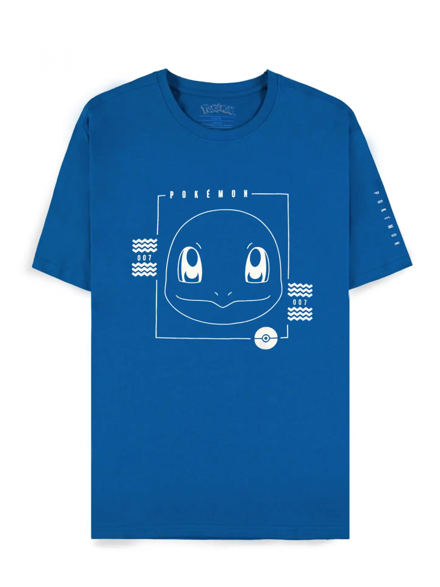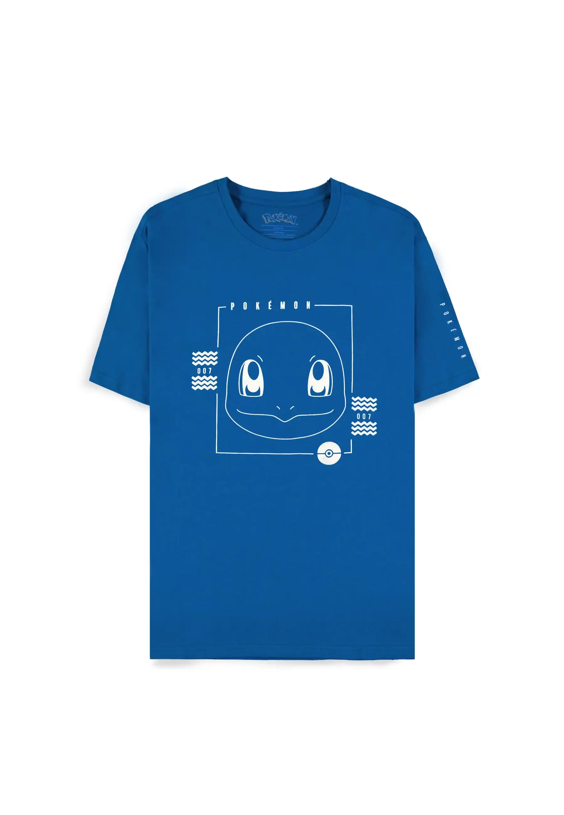 Stílusos kék póló minimalista Squirtle-motívummal – az első generáció egyik ikonikus Pokémonjával.