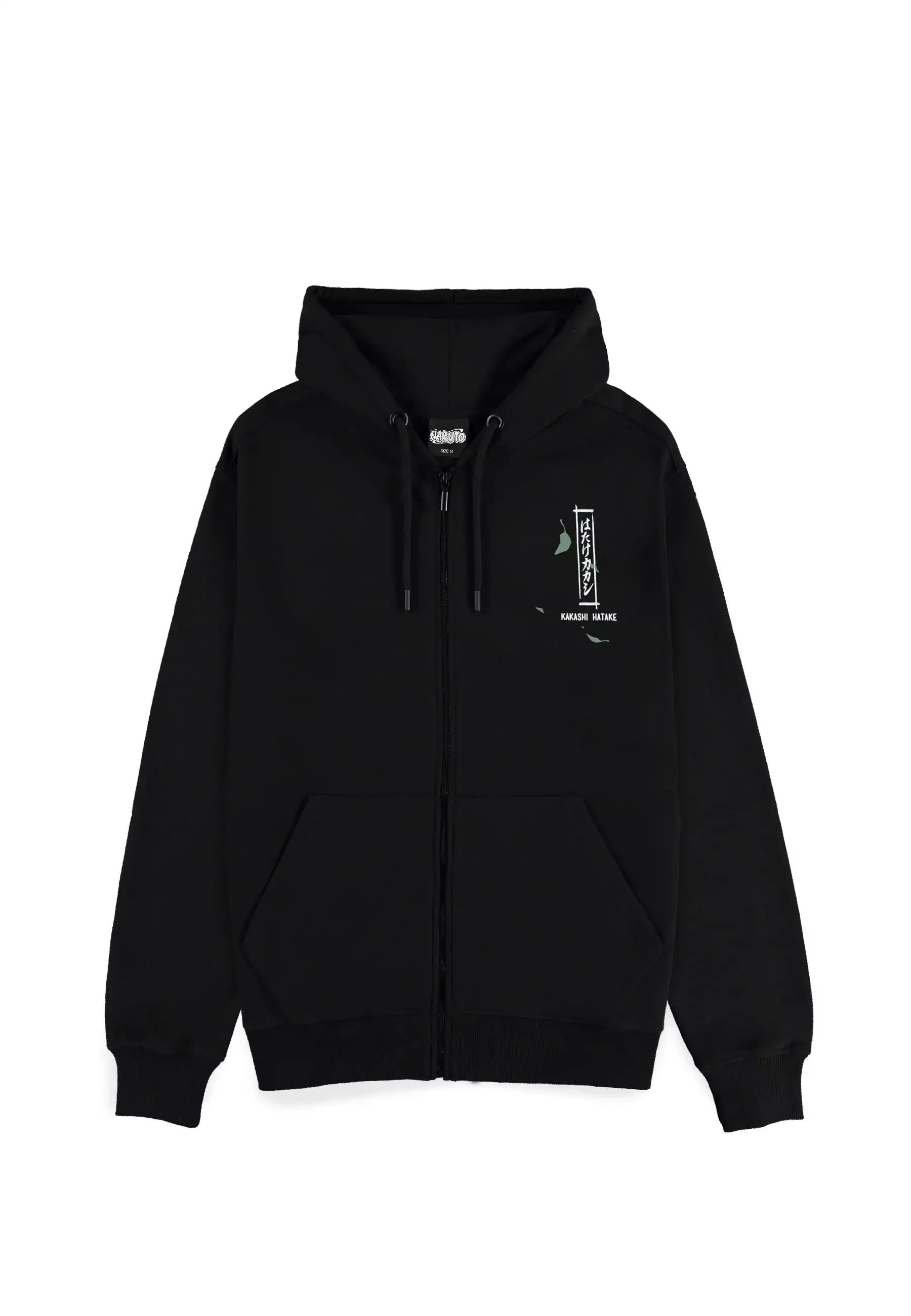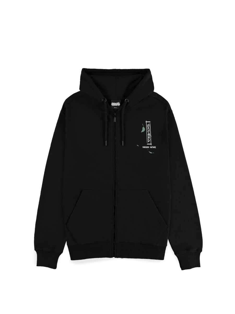 Stílusos, fekete cipzáras pulóver Kakashi letisztult, minimalista motívumával – tökéletes választás minden Naruto-rajongónak.