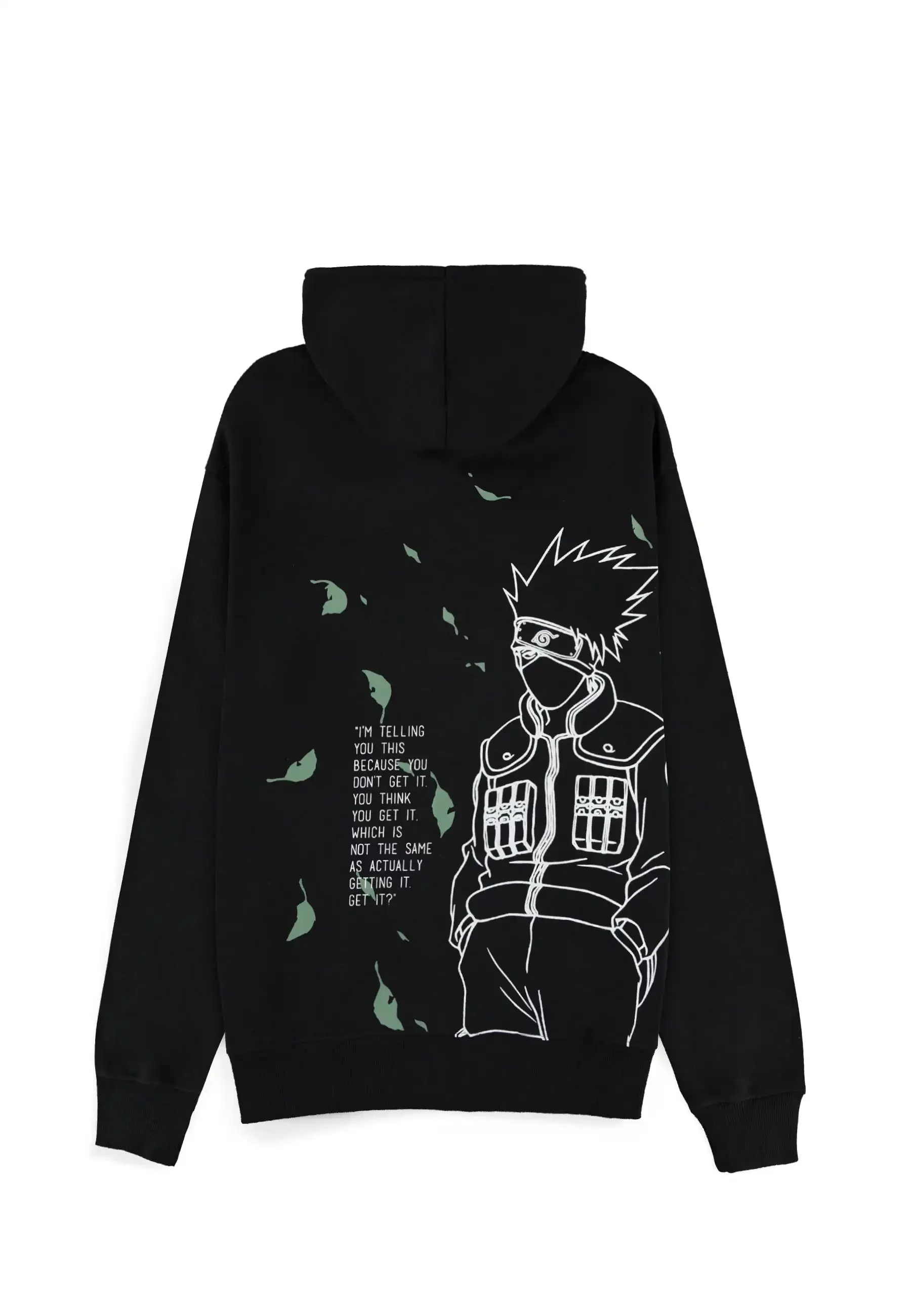 Az elején visszafogott nyomat található a nevével, a hátoldalon pedig egy látványos Kakashi-grafika az ikonikus idézettel kiegészítve. Kényelmes szabása, húzózsinóros kapucnija és praktikus zsebei miatt ideális a mindennapi viselethez.