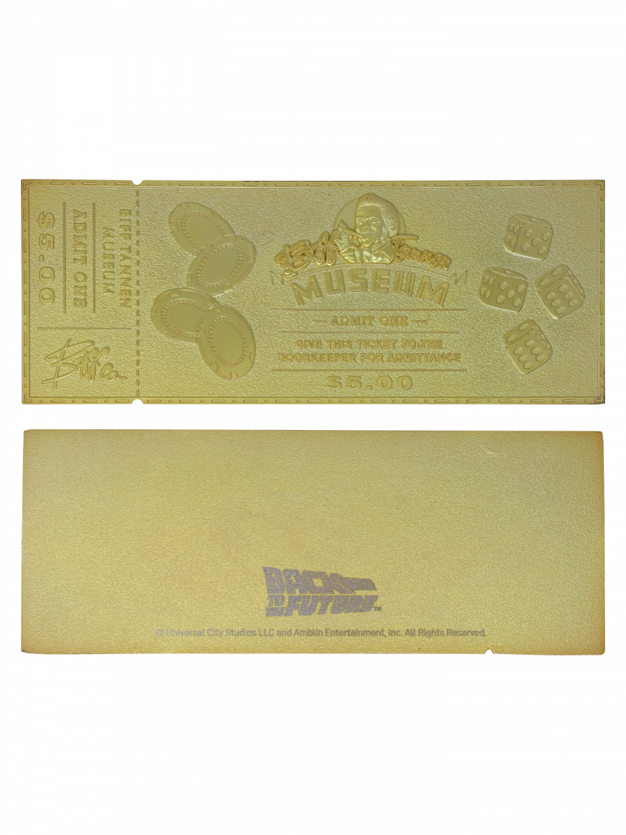 A Biff Tannen Múzeum luxus belépőjegy replikája minden rajongót lenyűgöz, aki imádja a jövőt és az alternatív idősíkok világát. A 24 karátos arannyal díszített, limitált kiadású darab a második film egyik ikonikus pillanatát idézi meg, és valódi gyűjtői élményt nyújt.