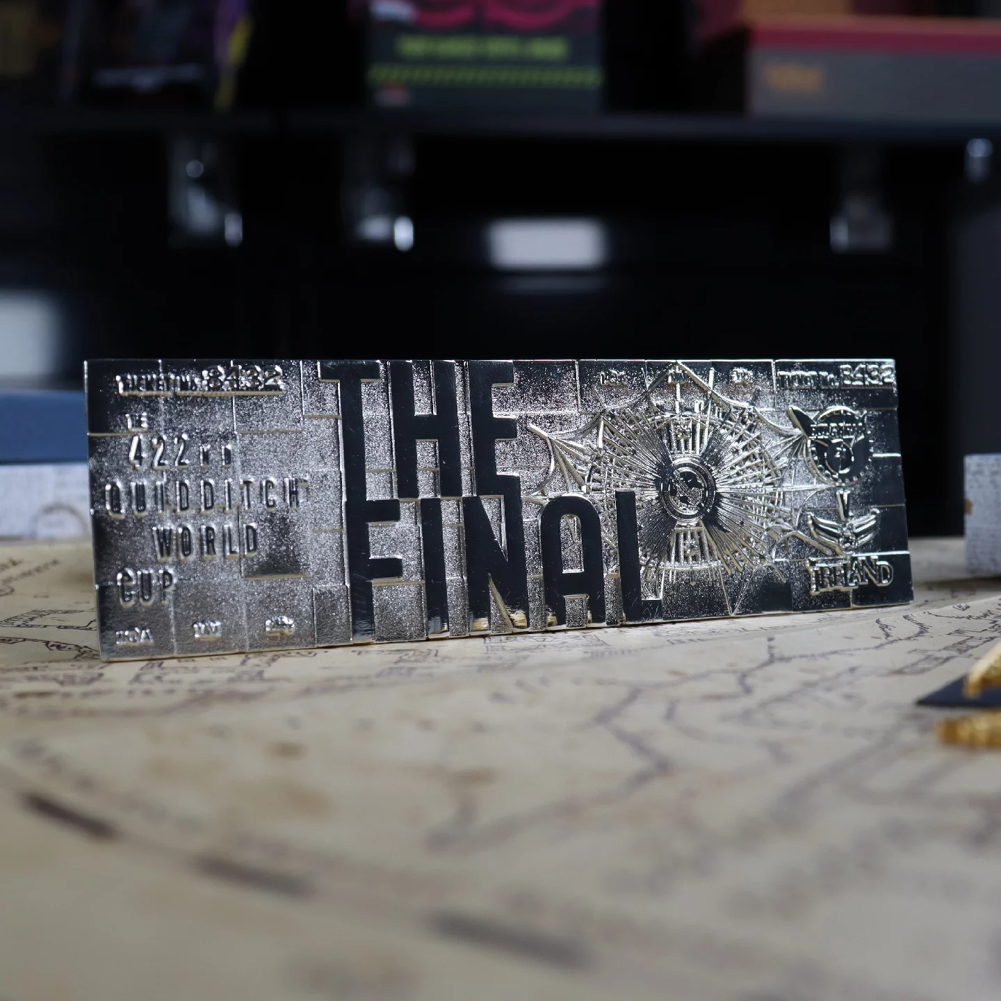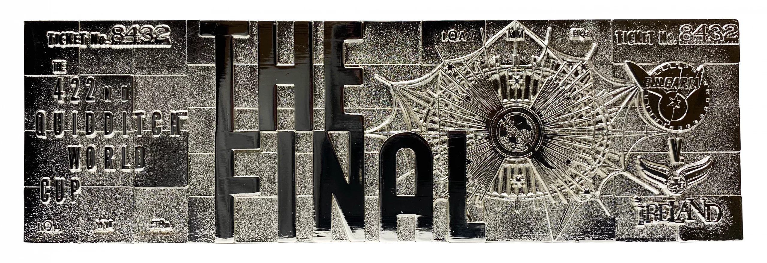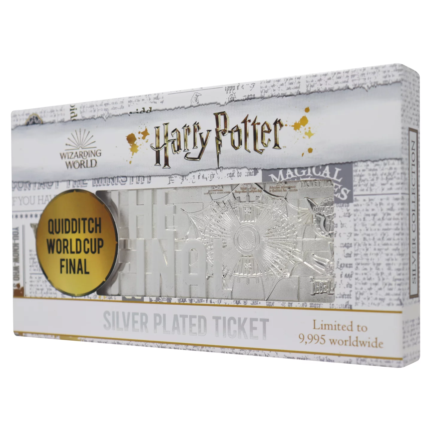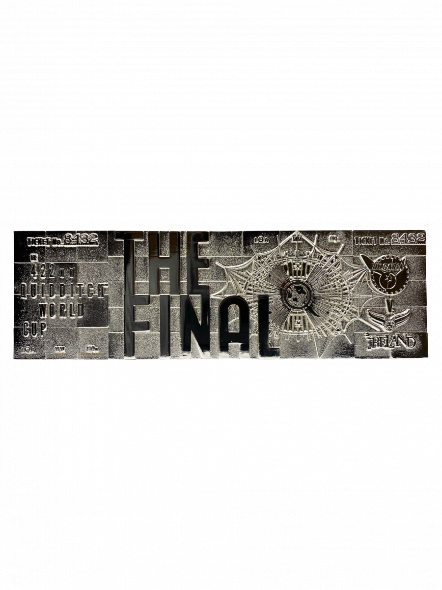 A Kviddics-világkupa döntőjének ezüst beléptetőjegy-replikája egy igazán különleges gyűjtői darab minden Harry Potter-rajongó számára. A jegy .999 tisztaságú ezüst bevonatot kapott, és részletgazdag, dombornyomott mintázata a híres mérkőzés eseményeit idézi fel, ahol Bulgária és Írország csapott össze.
