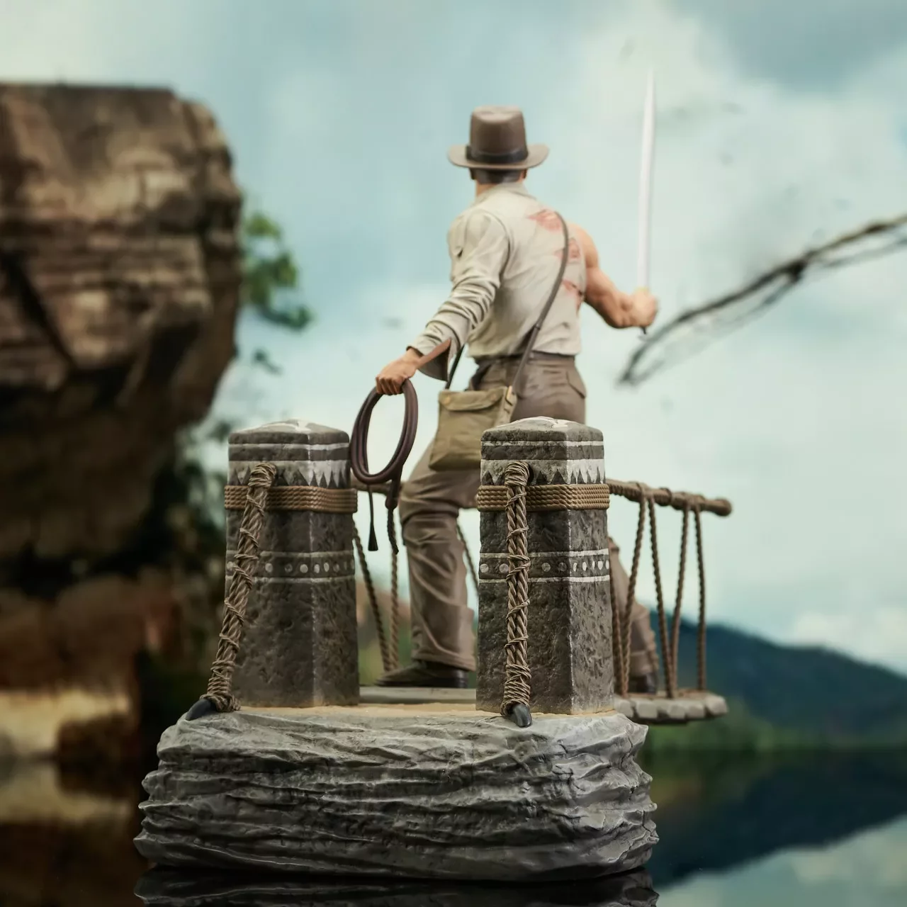 A Diamond Select Toys művészei az Indiana Jones és a végzet temploma híres jelenetét egy tökéletesen kidolgozott diorámává alakították át. Indy a kihúzott machetéjével egy részletes kötélhíd-alapzat egészíti ki. Valaki megkívánta a hűtött majomagyat? -