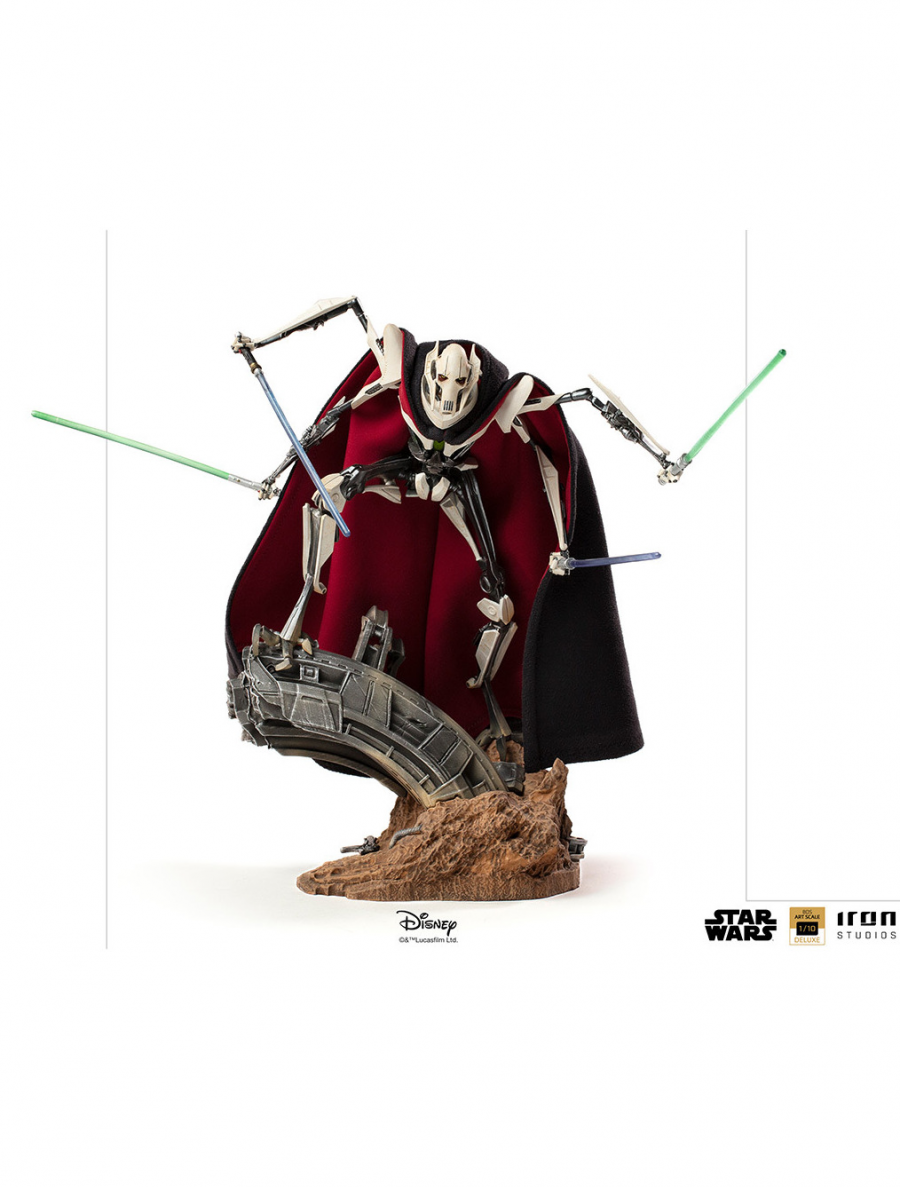Az Iron Studios büszkén mutatja be a "General Grievous Deluxe BDS Art Scale 1/10 - Star Wars" szobrot egy kiborg testtel, amely fokozott harci képességeket ad neki. A Jedi Rendnek ez a félelmetes ellensége készen áll mindenkit kiirtani, aki az útjába áll. Gyászos jégeső a Kalee bolygóról. A múltban nagy harcos volt, később a katonai stratégia és taktika szakértője lett. Miután egy súlyos balesetet szenvedett, amelyben majdnem meghalt, számos kiberimplantátumot kapott, amelyek révén teste inkább gép, mint élő szövet. Igazi arcát maszk alá rejti, robottestét pedig köpeny takarja.A figura csomagolása enyhén sérült, a figura hibátlan állapotú.