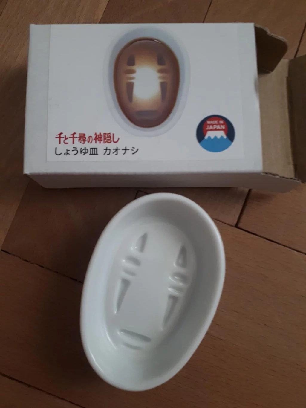 Szójaszószos tálka vicces kivitelű, amit más japán szójaszószos tálkákon is láttam - ha egy kis szójaszószt öntök bele, az egyenetlen alj miatt megjelenik egy árnyékolt kép. A Kaonashi ebben a tálkában tökéletes. Szeretném megdicsérni a jó minőségű porcelánt is. Pont annyi szójaszósz fér bele, a perem alacsony, így a sushi jól belemártható. Remek kiegészítő a konyhába, és különösen a sushi-rajongóknak és a Ghibli-stúdió szerelmeseinek nélkülözhetetlen.